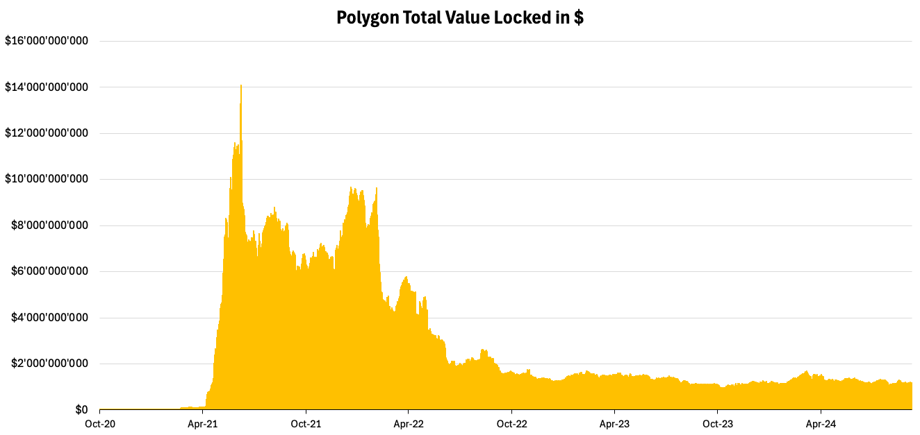 This shift was accelerated by key exchanges like Binance completing their migration last week. POL’s listing triggered a 15% price jump in POL, underscoring the market's response to this upgrade. The migration not only brings technical advancements to the network but also serves as a catalyst for investor’s interest. In that view, the migration has the potential to spotlight Polygon’s role and revitalize the chain after a period of slow growth, where Total Value Locked (TVL) has not grown since the start of 2023, as shown below.