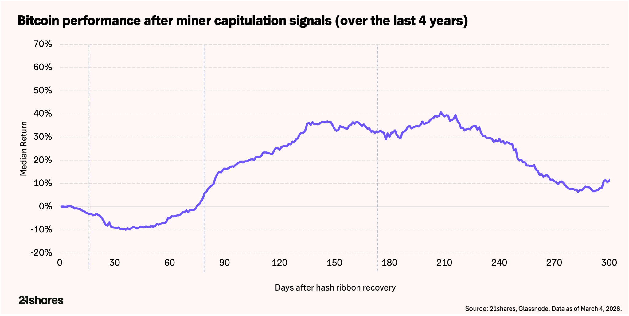 Miner capitulation nearing its end: The Hash Ribbon indicator is approaching a recovery signal after nearly three months of capitulation. Over the past four years, similar signals have been followed by median bitcoin returns of roughly 16% over three months, 32% over six months, and nearly 60% over the following year. The signal does not necessarily mark the exact bottom, but it has historically appeared during periods when selling pressure from miners is largely exhausted, and accumulation phases begin.