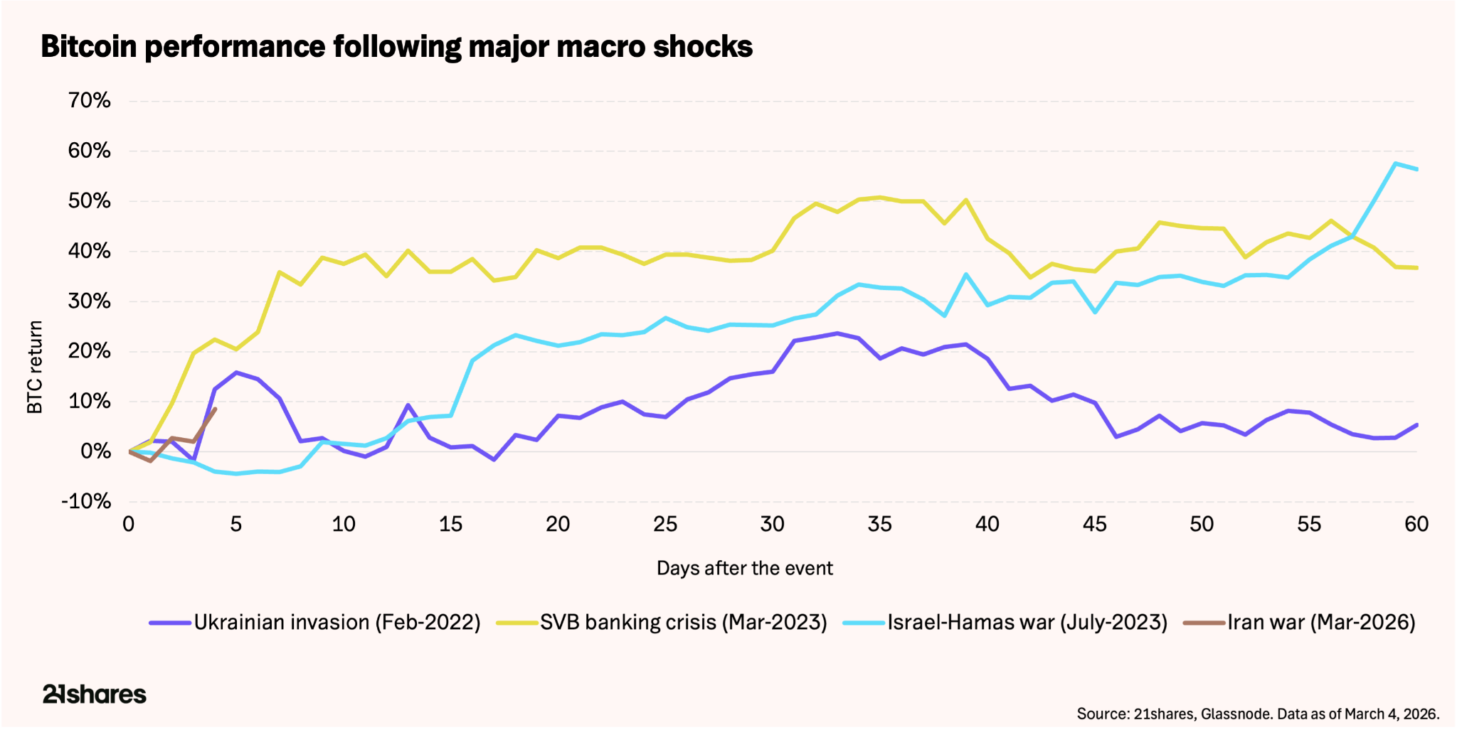 The structural case strengthens: Geopolitical shocks have consistently produced sharp drawdowns in bitcoin, followed by rapid recoveries: