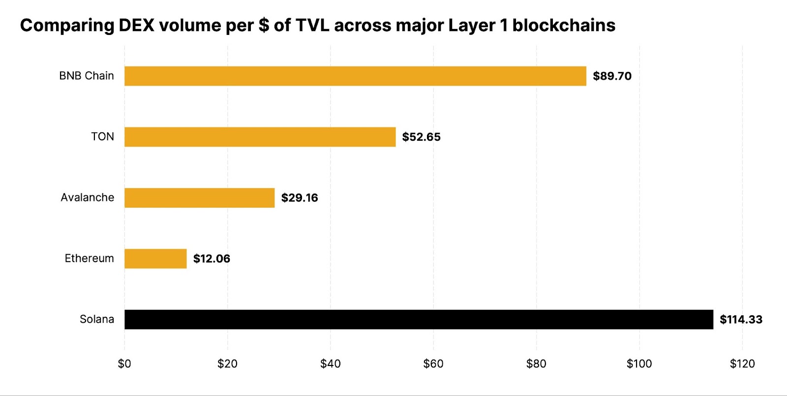 Figure 9 – Comparing DEX volume per $ of TVL across major Layer 1 blockchains