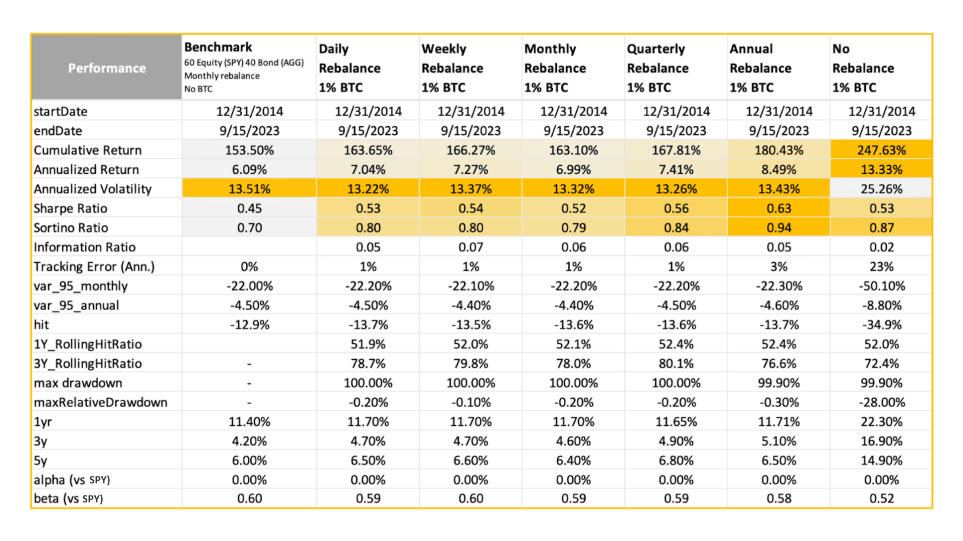 - Rebalancing is key: However, when adding bitcoin without rebalancing, overall risk suffers with 50.48% annualized volatility, almost four times higher than the benchmark of 13.30%. The most efficient rebalancing schedule is annual. This strategy has historically proven to be maximizing cumulative returns (256.71%) and the Sharpe (0.84) and Sortino (1.25) ratios.