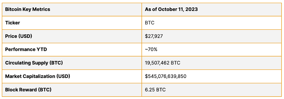 Bitcoin is an emerging store of value asset often called the world’s first “digital gold” and may provide a viable hedge against global economic instability. Over the last three years, Bitcoin surged by over 120%, making it one of the best-performing assets over the last decade. Currently, Bitcoin’s total market capitalization sits at over $540 billion. The rest of this report will also show that there is still a potential upside for Bitcoin and its technology in the foreseeable future. The first table (below) shows some of the current key metrics for Bitcoin, including its price, circulating supply (the number of BTC currently in existence), and market capitalization. The second table demonstrates where Bitcoin sits in the asset superclass amongst equities, commodities, real estate, and other asset classes.
