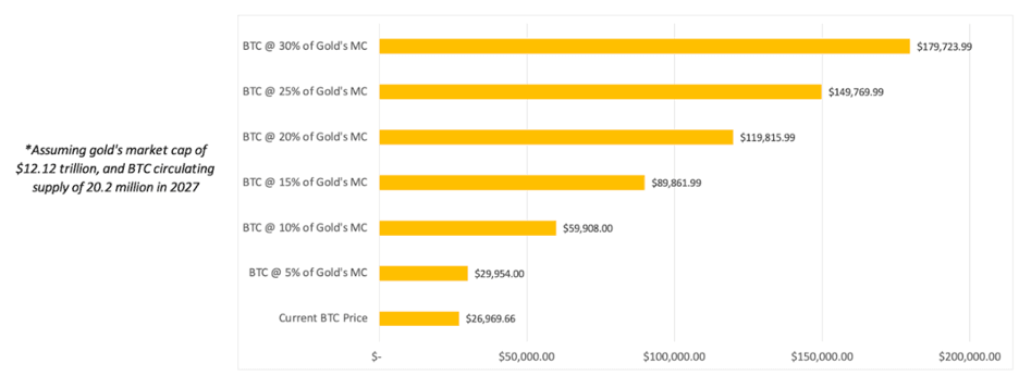 As of September 30, the price of BTC is $26,970, with an implied circulating market cap of ~$526 billion. On the other hand, the market cap of gold sits at around $12.12 trillion. Thus, we can use the market sizing methodology described above to estimate the hypothetical price of BTC if it were to capture a given percent share of gold’s market cap. For instance, Figure 4 shows that if BTC were to capture 10%, it would be priced at $59,908. In the most optimistic scenario contemplated, if BTC penetrates 30% of gold’s market cap, the price of one BTC would be $179,724.