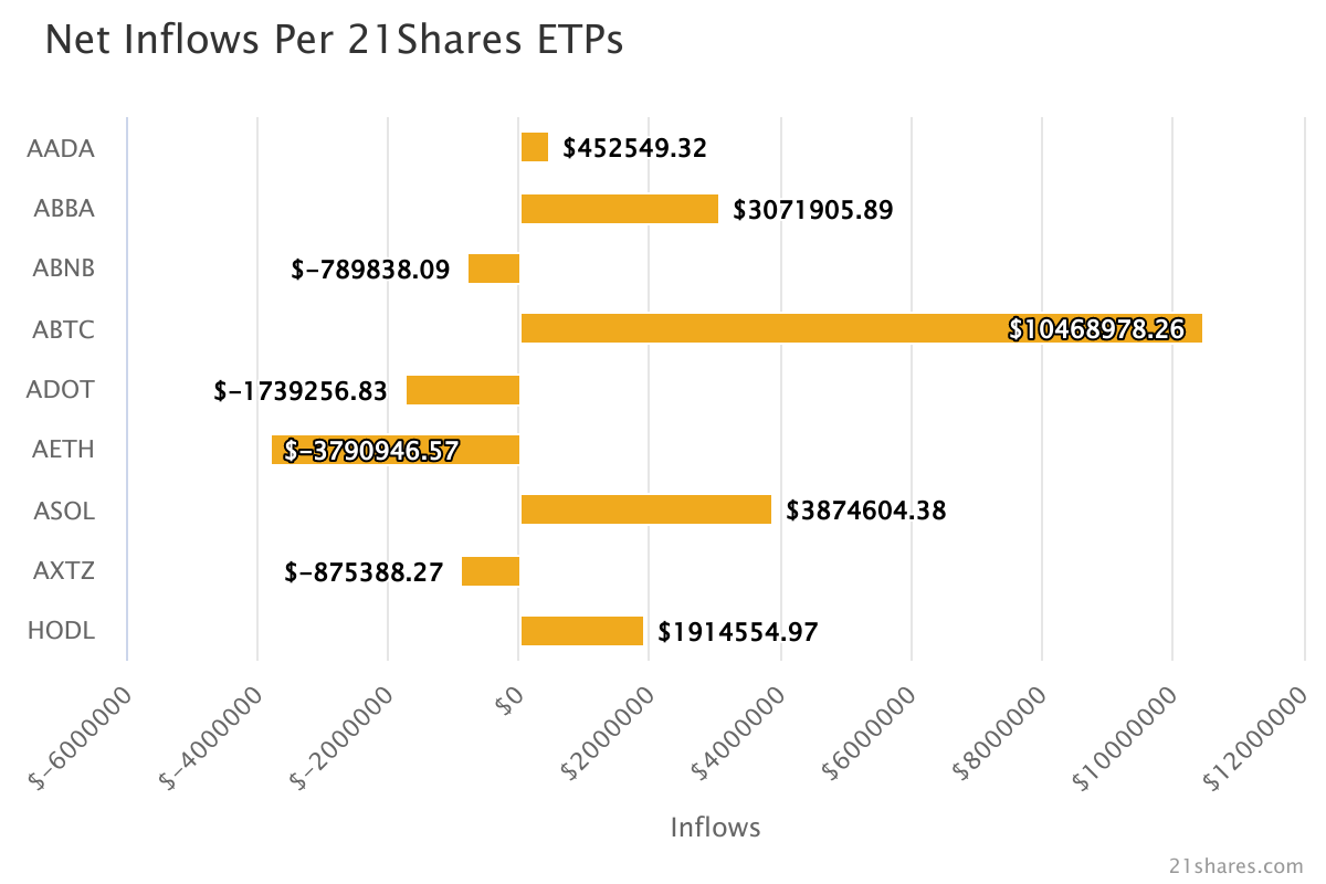 The net inflows of our ETPs combining $23.01 million in the past week, were as follows: AADA (+$452,549.32), ABBA (+$3,071,905.89), ABNB(-$ 789,838.09), ABTC (+$ 10,468,978.26), ADOT (-$ 1,739,256.83), AETH (-$ 3,790,946.57), ASOL (+$ 3,874,604.38), AXTZ (-$ 875,388.27), HODL (+$ 1,914,554.97).