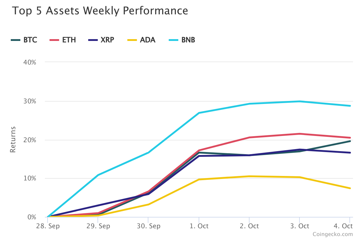 The returns of the top five crypto assets over the last week were as follows — BTC (19.5%), ETH (20.45%), BNB (28.69%), XRP (16.6%), and ADA (7.4%).