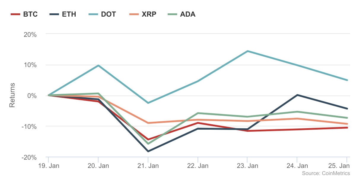 The returns of the top five cryptoassets over the last week were as follows — BTC (-10.57%), ETH (-4.36%), DOT (4.92%), XRP (-9.32%), and ADA (-7.36%).