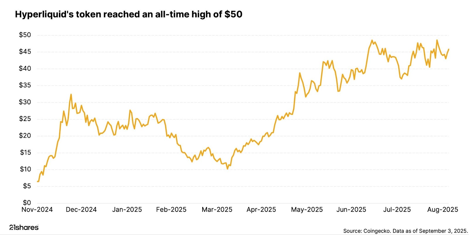 The native token, HYPE, reached a peak of $50.99 in late August. Analysts attribute this increase to record trading activity and the protocol’s automated token buyback mechanism, which directs a significant portion of fees into market purchases, which helps reduce the circulating supply.