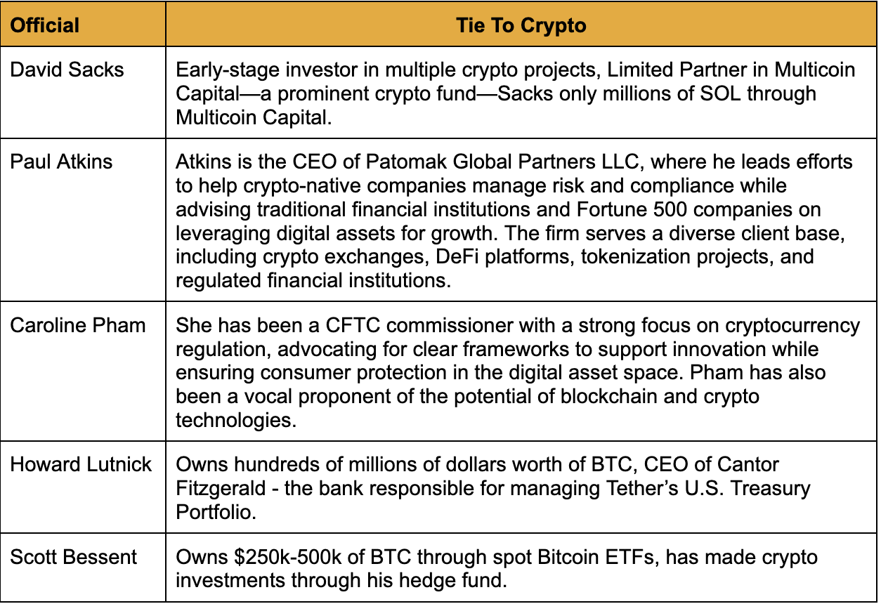 To implement these policy objectives, the administration has established the President’s Working Group on Digital Asset Markets within the National Economic Council. This group, chaired by the Special Advisor for AI and Crypto, David Sacks, brings together key officials from the Treasury Department, SEC, DOJ, and other relevant agencies to develop a cohesive regulatory framework for digital assets. Other than Sacks, some notable key officials included are