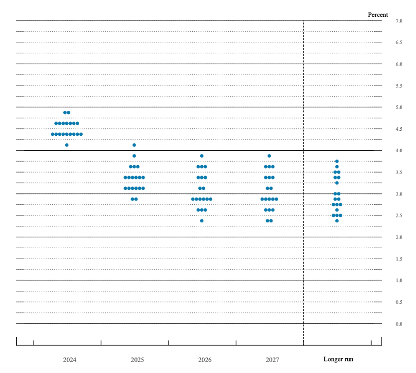 Looking ahead, as the fed dot plot shows below, 17 Federal Reserve officials now anticipate further easing in 2024, while just two project rates to hold steady for the rest of the year. Of those expecting cuts, seven forecast one more rate reduction, while nine foresee two additional cuts. One official predicts as many as three more rate cuts before the year ends.