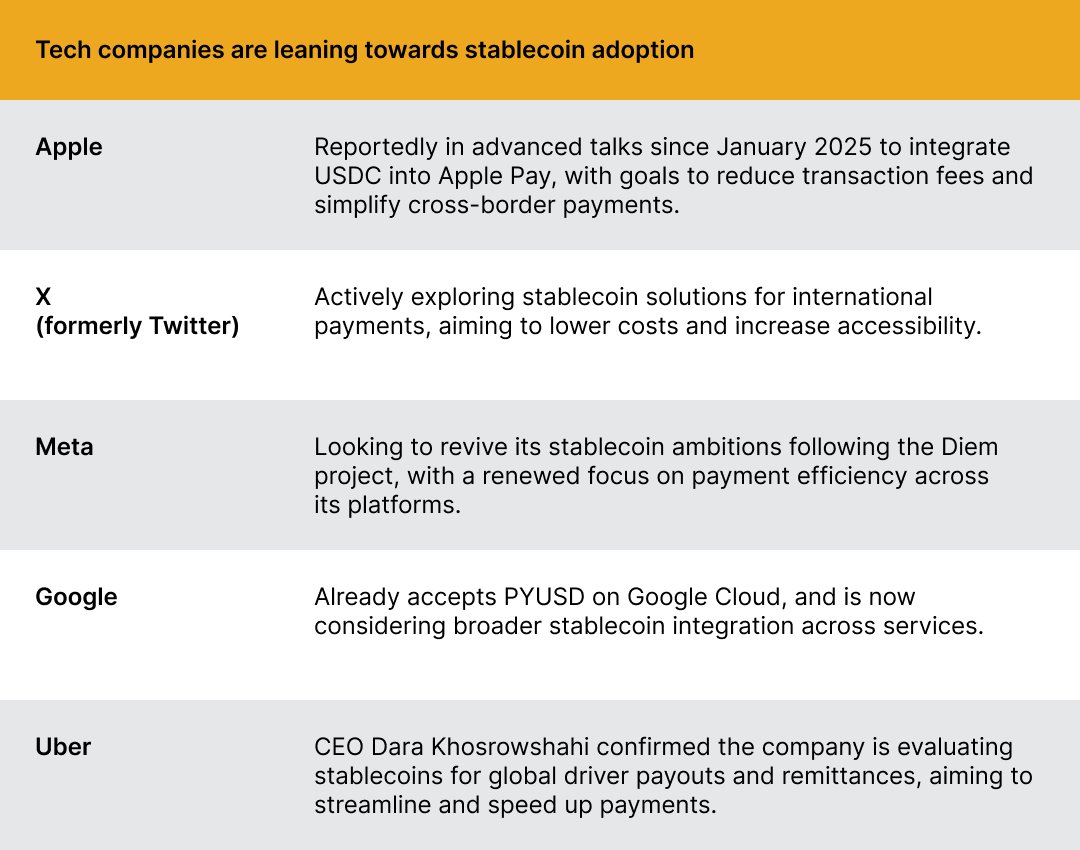 Now, with big tech exploring stablecoin adoption, it signifies a pivotal shift toward the convergence of traditional finance, crypto innovation, and big tech infrastructure.