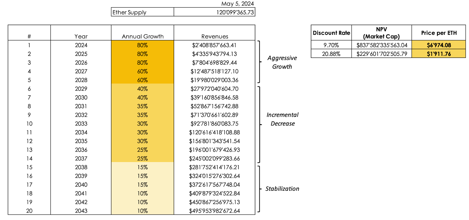 - Future cash flows: We propose a slight variation of the three-stage growth model to project Ethereum’s future cash flows. Specifically, we forecast an initial period of aggressive growth, followed by an incremental decrease that eventually stabilizes at a more moderate growth rate.