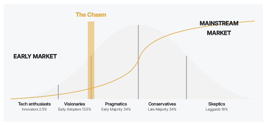 One way to more accurately gauge a given cryptoasset’s level of penetration of its TAM is through the “S-curve.” The S-curve theory states that technologies grow and emerge in multiple waves. It was initially proposed by E.M Rogers in 1962 as the Diffusion of Innovation (DOI) Theory to explain how, over time, a new technology gains momentum and spreads through a specific population or social system.