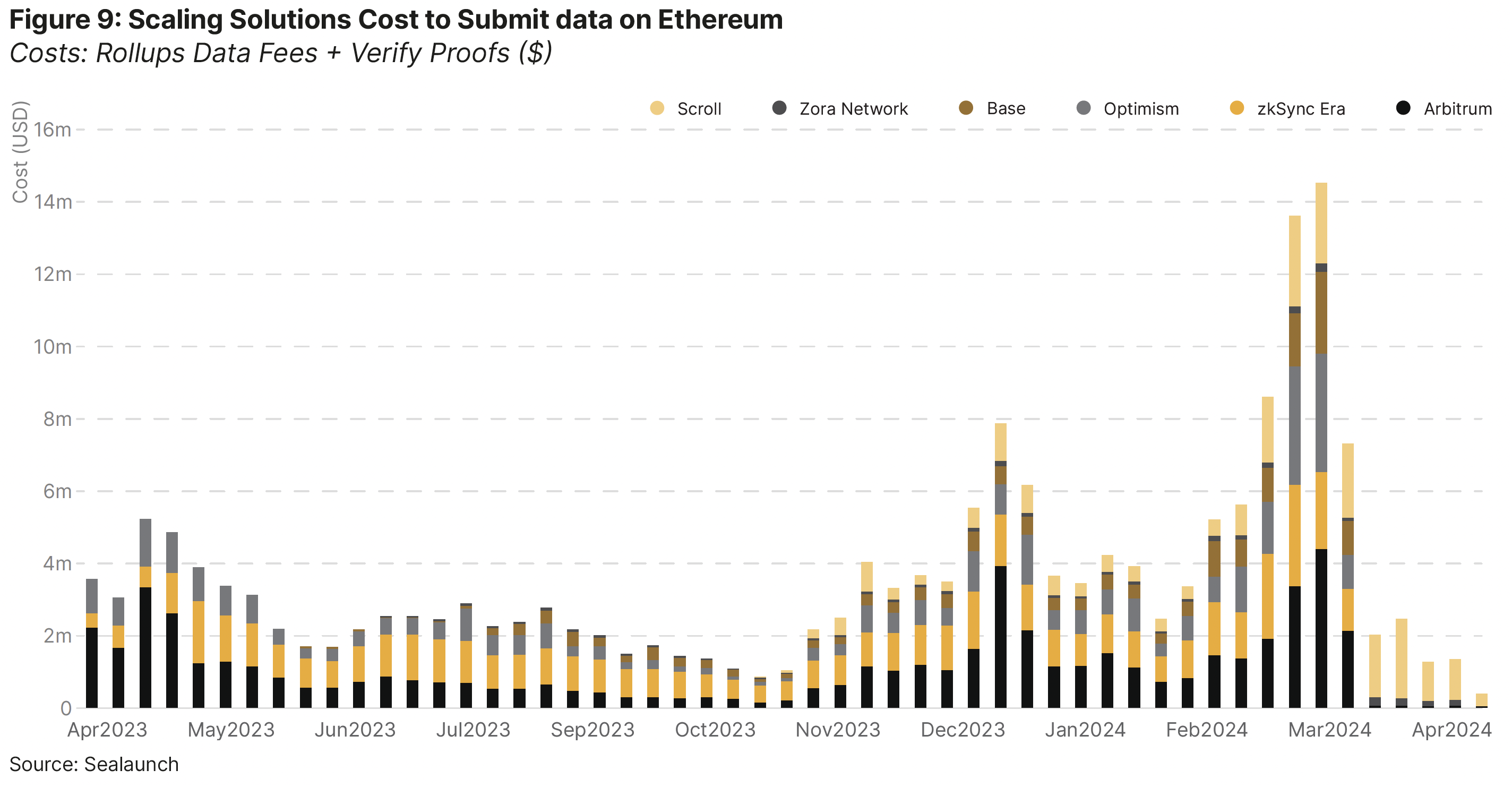 What’s worth remembering here is that L2s built on top of Ethereum actually help accrue value back to ETH. Given that the majority of L2s require users to pay transaction fees in ETH - in what is known as security costs - the growing transactions and activities occurring on Layer 2 solutions contribute significantly to the overall demand for Ethereum’s native token, ETH. This increased demand, coupled with the burning of ETH, can lead to a potential increase in the value of ETH as it becomes scarcer and more sought after within the Ethereum ecosystem. Therefore, while it might initially seem that scaling solutions diminish Ethereum’s transaction processing revenue, this evolving dynamic actually paves the way for a secondary revenue stream for the platform as Ethereum continues to serve as their final settlement platform.