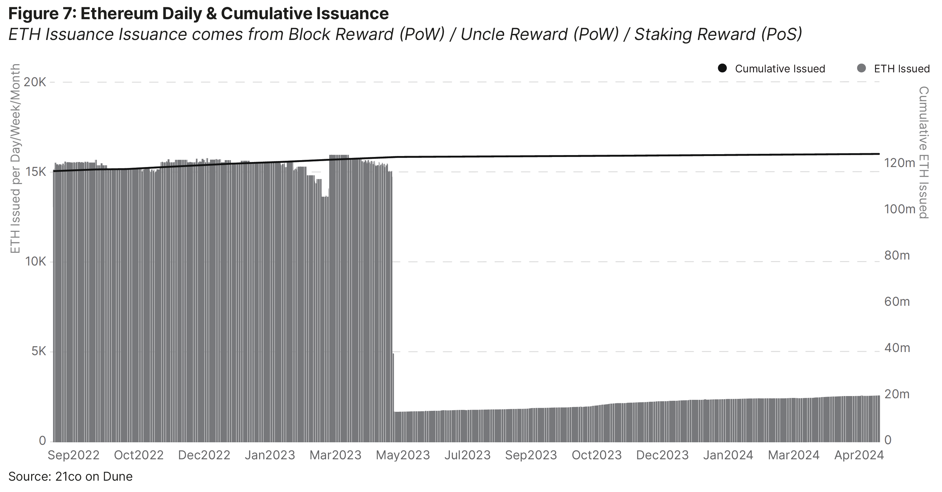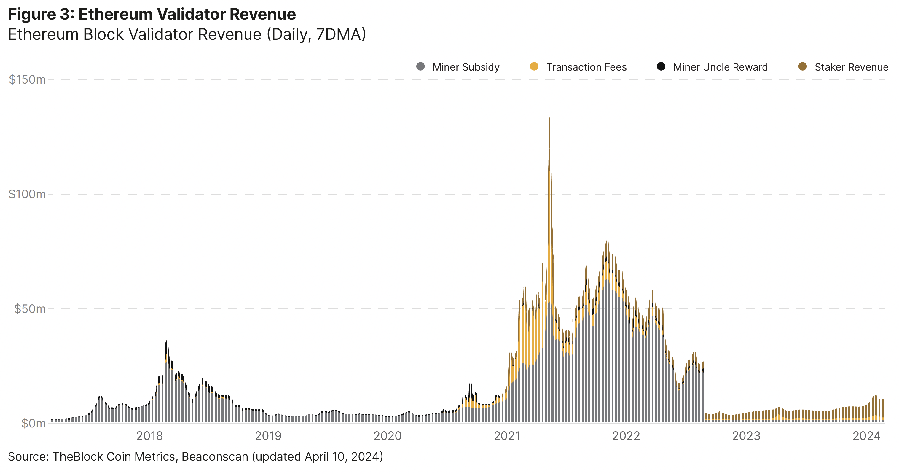 Block rewards: Pre-Merge, people wishing to mint coins received a fixed amount of ETH per block. It started with 5 ETH, then got reduced to 3 ETH per block in 2017, then 2 ETH in 2018 until the Merge in 2022. After Ethereum adopted the Proof-of-Stake (PoS) consensus mechanism, block rewards were no longer fixed or programmed like Bitcoin’s reward system. Now the block rewards come entirely from transaction fees, in addition to the returns received on the validators’ staked ETH, as shown in figure 3.
