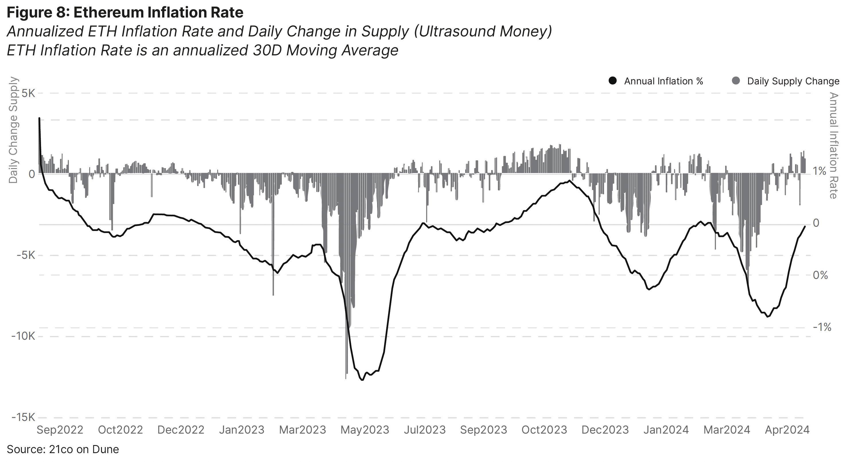Ethereum’s supply dynamics are undergoing a significant transformation, driven by innovative mechanisms and protocol upgrades aimed at enhancing efficiency and sustainability. Historically, Ethereum operated on a similar issuance model to Bitcoin, with miners rewarded with newly minted Ether (ETH) for validating transactions through the PoW consensus mechanism. However, Ethereum’s journey towards becoming a deflationary asset began with the introduction of the London hard fork in August 2021, which introduced a number of EIPs.