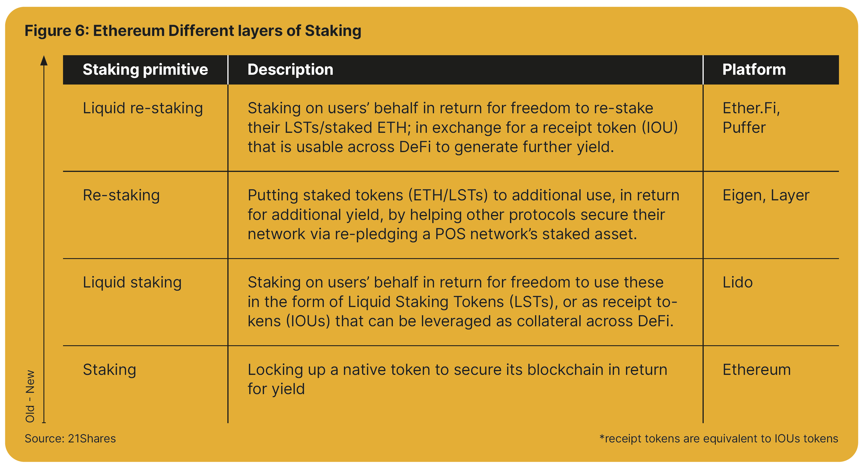 New primitives like liquid staking, re-staking, and liquid re-staking have emerged and are being battle-tested but have gained a lot of traction since the Ethereum PoS conversion. Figure 6 breaks them down, while giving an example of decentralized apps (dApps), respective of each category.