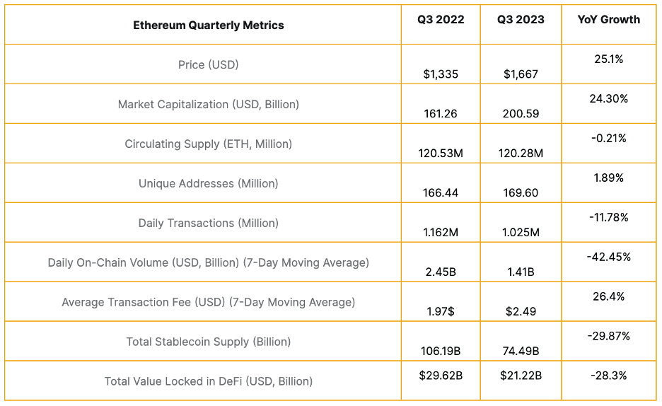 Table 2: Ethereum Quarterly Metrics (Source: Etherscan, CoinMetrics, DeFi Llama)