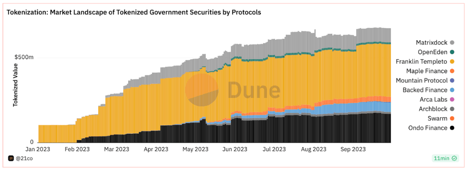 The tokenization of traditional financial products is another flourishing sector. Especially tokenized U.S. Treasuries have witnessed a remarkable growth of over 450% this year, with a total of $650 million in assets. The rise of on-chain U.S. treasuries can be attributed to the prevailing high-interest-rate environment. Issuers include crypto natives such as Ondo and Backed Finance, alongside well-established traditional finance players like Franklin Templeton. While these platforms harness the power of public blockchain technology, accessibility remains confined by the requisite onboarding process involving KYC/AML (Know Your Customer/Anti-Money Laundering) procedures or geographical limitations. Although this may appear counterintuitive to the ethos of crypto, given the current limited accessibility, this issue is likely to be resolved through technological and regulatory advancements. Moreover, it also aligns with our thesis that innovation primarily occurs in the backend infrastructure, exemplified by the utilization of a public blockchain for settlements and tokenization.