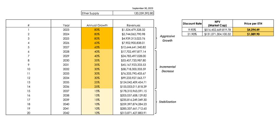 - a. Future cash flows: We propose a slight variation of the three-stage growth model to project Ethereum’s future cash flows. Specifically, we forecast an initial period of aggressive growth, followed by an incremental decrease that eventually stabilizes at a more moderate growth rate.