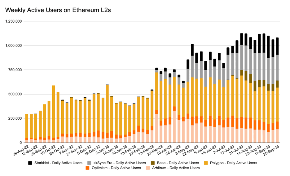 Layer 2s have been growing significantly over the last two years. Weekly active users on the leading Ethereum scaling platforms have more than doubled from ~450k in November 2022 to more than 1 million as of September 2023 (see Figure 4). Ethereum’s scaling thesis is becoming a reality as multiple L2 networks converge upon similar architectures and compete for the most network effects. While it’s still unclear which will win, the fierce competition between L2s is unequivocally positive for Ethereum, as they directly accrue value to Ethereum, acting as their settlement layer, as well as contributing towards bringing on an influx of new developers, applications, and users.