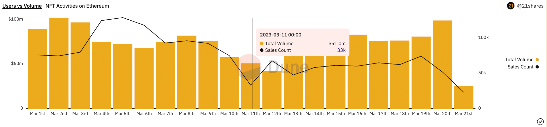 NFT trading dipped due to SVB collapse, but there’s a silver lining: As uncertainty loomed around the safety of USDC, NFT traders went silent. March 11 saw the least number (11,440) of active traders since November 2021. According to data gathered by Dappradar, the sales count dropped by 16% while trading volume dropped by 51%, and recovered shortly after. The flight to Bitcoin seen over the past week, coupled with NFT inscriptions on the network, have all been contributing to Bitcoin’s resistance. On March 16, DeGods announced there would be 500 NFTs minted with Bitcoin. According to the Ordinals Theory, a count of 500  one-hundred-millionth of a Bitcoin will carry ​​individual identities allowing them to be tracked, transferred, and imbued with meaning.