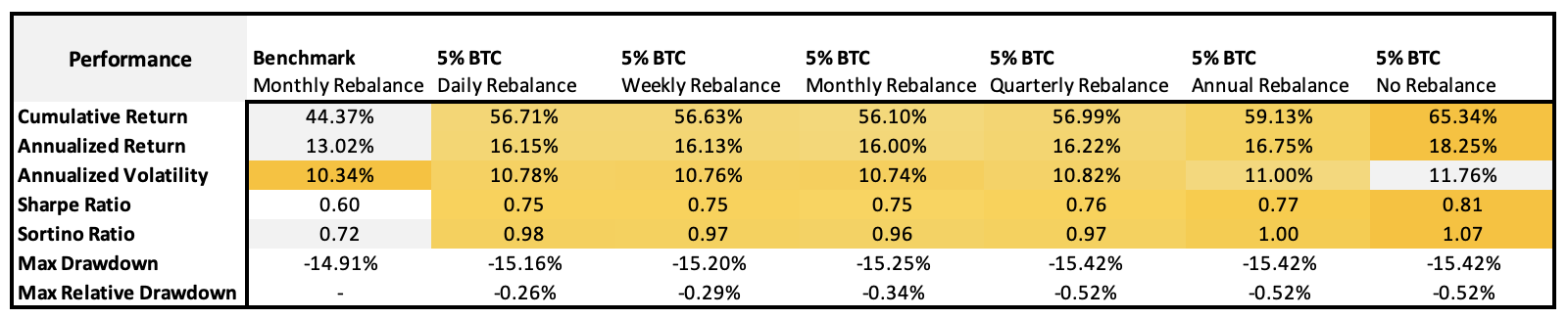 The tables below provide a detailed summary of portfolio outcomes across different crypto allocation sizes and rebalancing strategies.