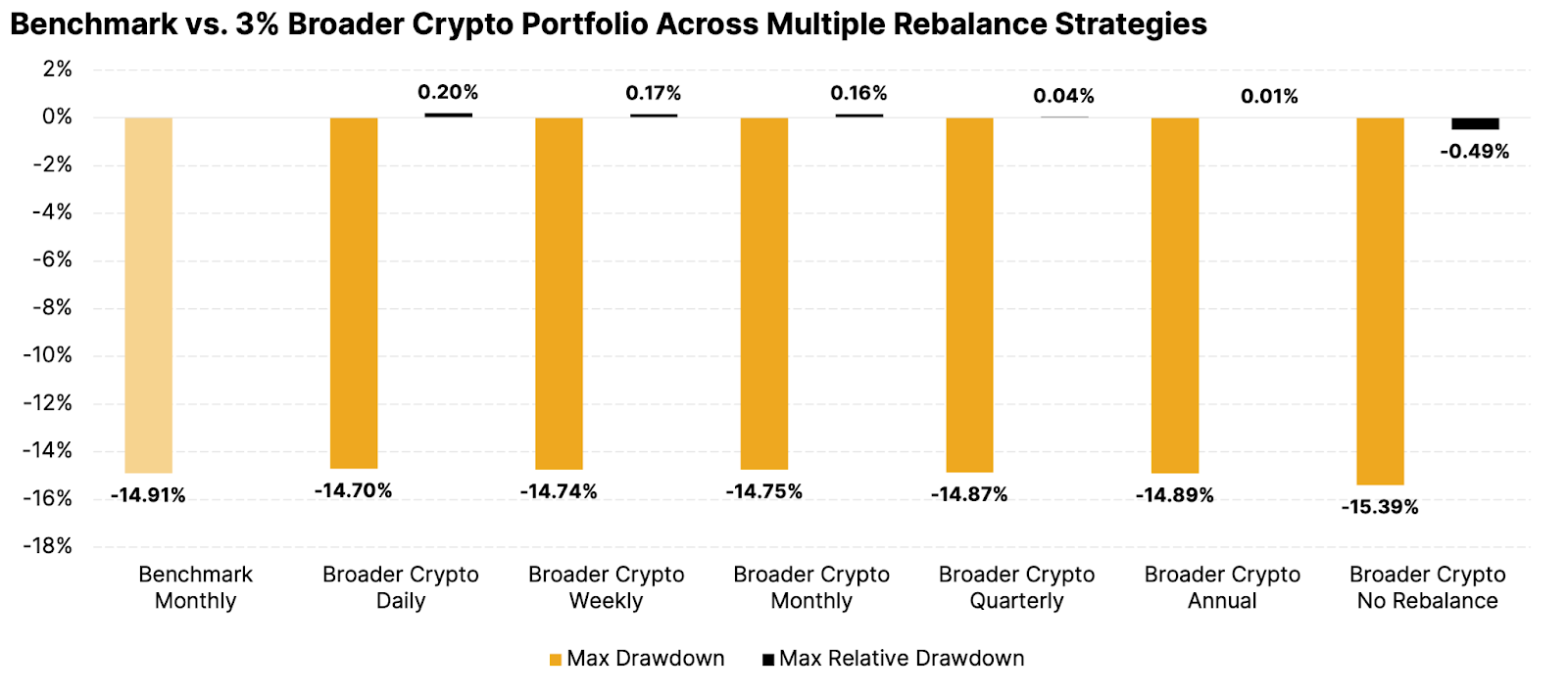 Well-Contained Downside Risk: Despite expanding to a 3% allocation in a diversified basket of top cryptoassets, downside risk remained remarkably well-managed, and in some cases, even improved compared to the benchmark. The benchmark portfolio experienced a maximum drawdown of –14.91%. In contrast, several of the crypto-allocated strategies recorded slightly lower drawdowns. For example, the daily rebalanced portfolio saw a maximum drawdown of just –14.70%, while the weekly and monthly rebalanced strategies registered –14.74% and –14.75%, respectively. These outcomes indicate that broader crypto exposure, when implemented with proper sizing and rebalancing discipline, can actually enhance portfolio resilience. Even the worst-performing approach in terms of downside experienced a drawdown of –15.39%, only marginally larger than the benchmark. Once again reinforcing the idea that introducing crypto exposure does not have to come at the cost of significantly greater downside risk.