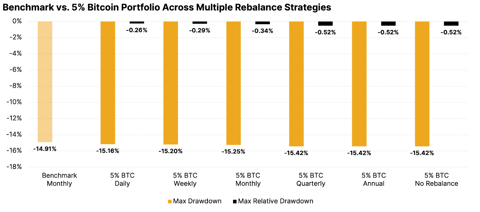 Volatility Remains Manageable: With a 1% Bitcoin allocation, portfolio volatility remained remarkably stable. Across all rebalancing strategies, annualized volatility ranged from 10.40% to 10.52%, while the non-rebalanced portfolio reached only 10.82%, a modest increase from the benchmark’s 10.34%. This shows that Bitcoin’s historical volatility doesn’t scale linearly at the portfolio level, especially when held as a small, diversified sleeve. Rather than amplifying risk, the 1% allocation often helped maintain overall volatility.