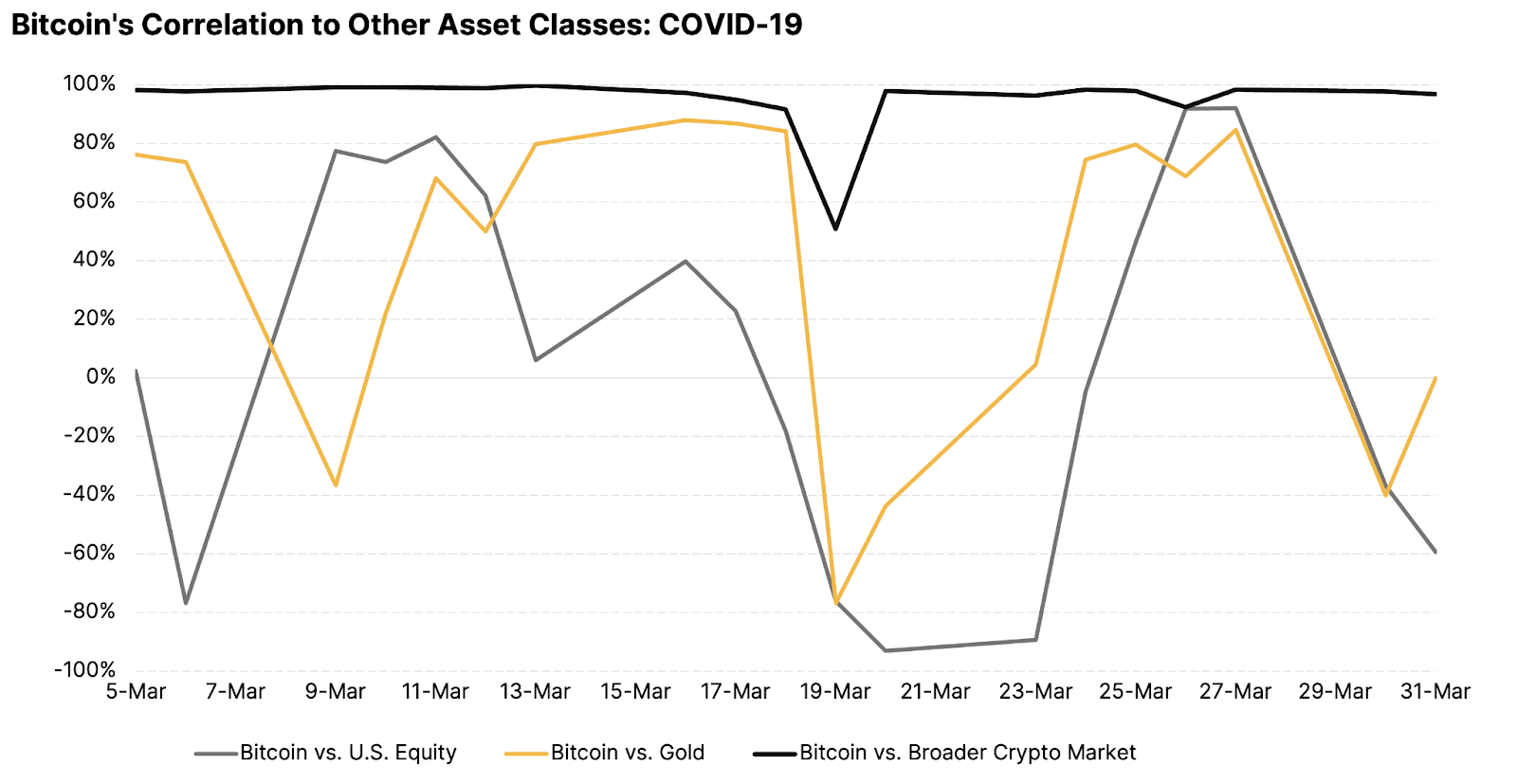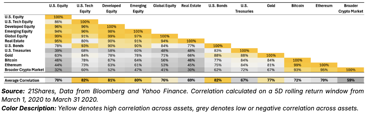 Source: 21Shares, Data from Bloomberg and Yahoo Finance. Correlation calculated on a 5D rolling return window from March 1, 2020, to March 31, 2020.