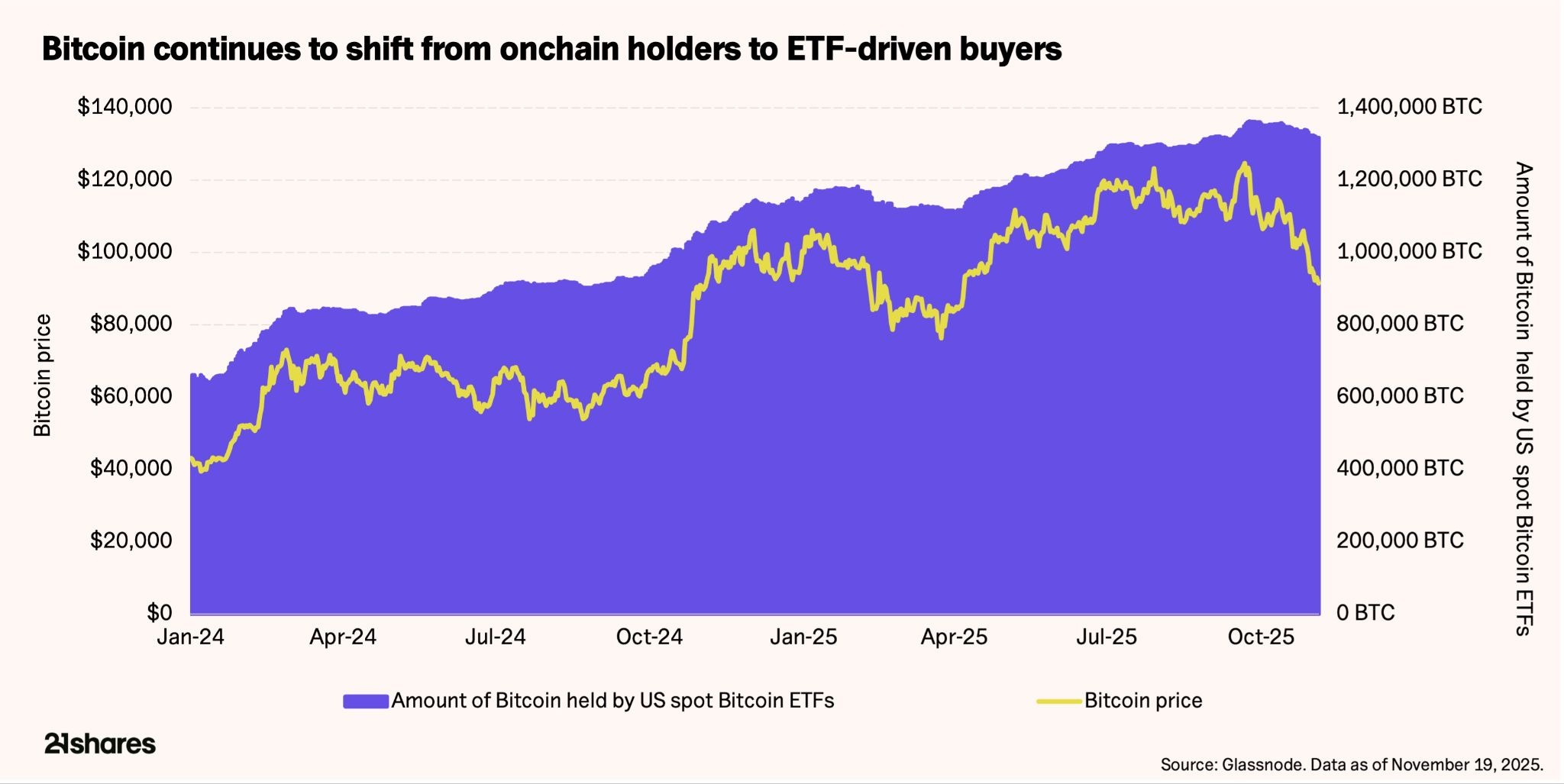 • Since their launch in 2024, US spot Bitcoin funds have accumulated nearly 1.3M Bitcoin, or around 7% of total supply, held in custodial storage.