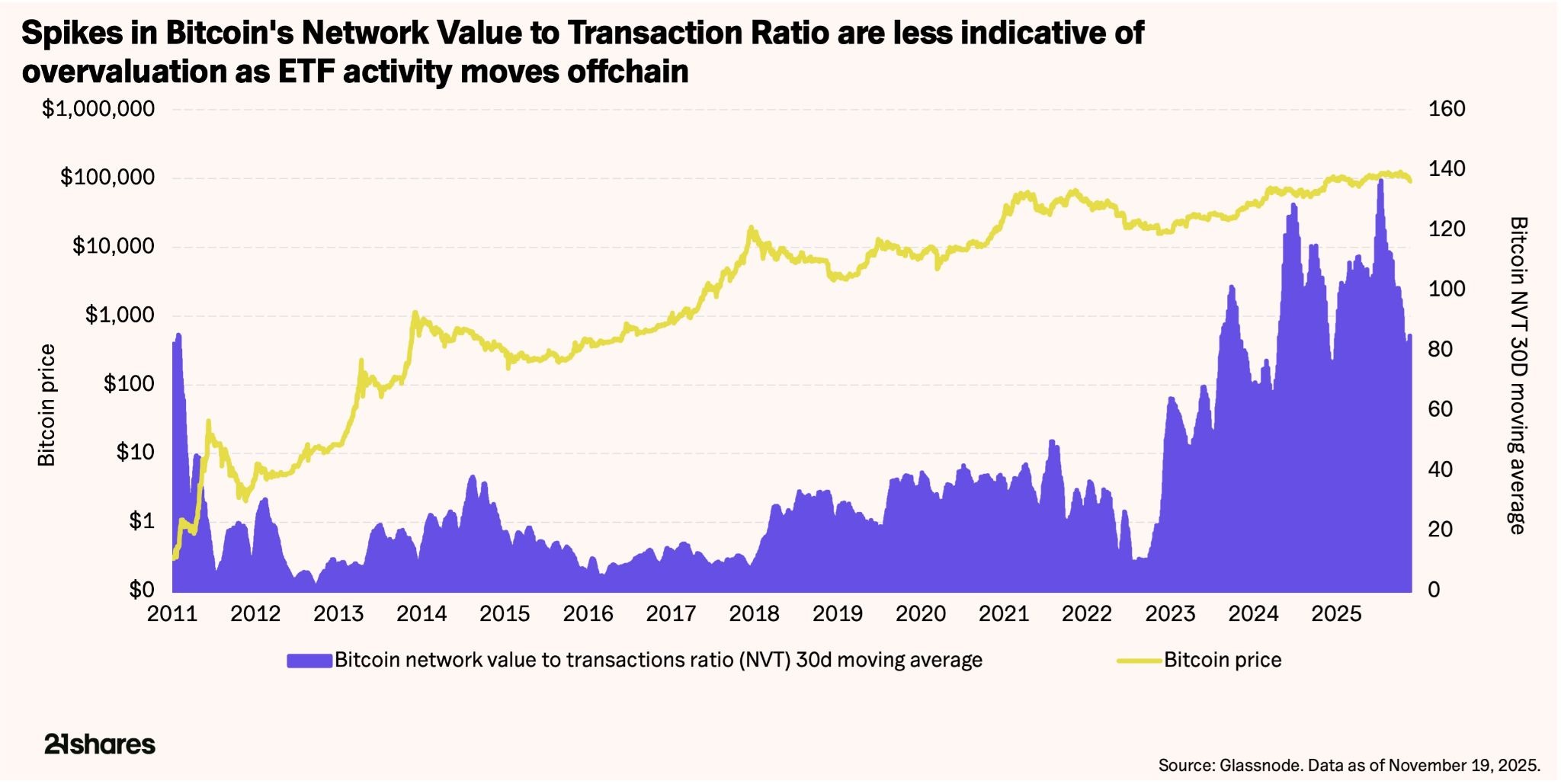 • The NVT ratio has become less reliable as so much activity now occurs offchain. Elevated readings do not always indicate overvaluation as they once did, and updating the measure to include ETF trading volumes and flows will make it more accurate.