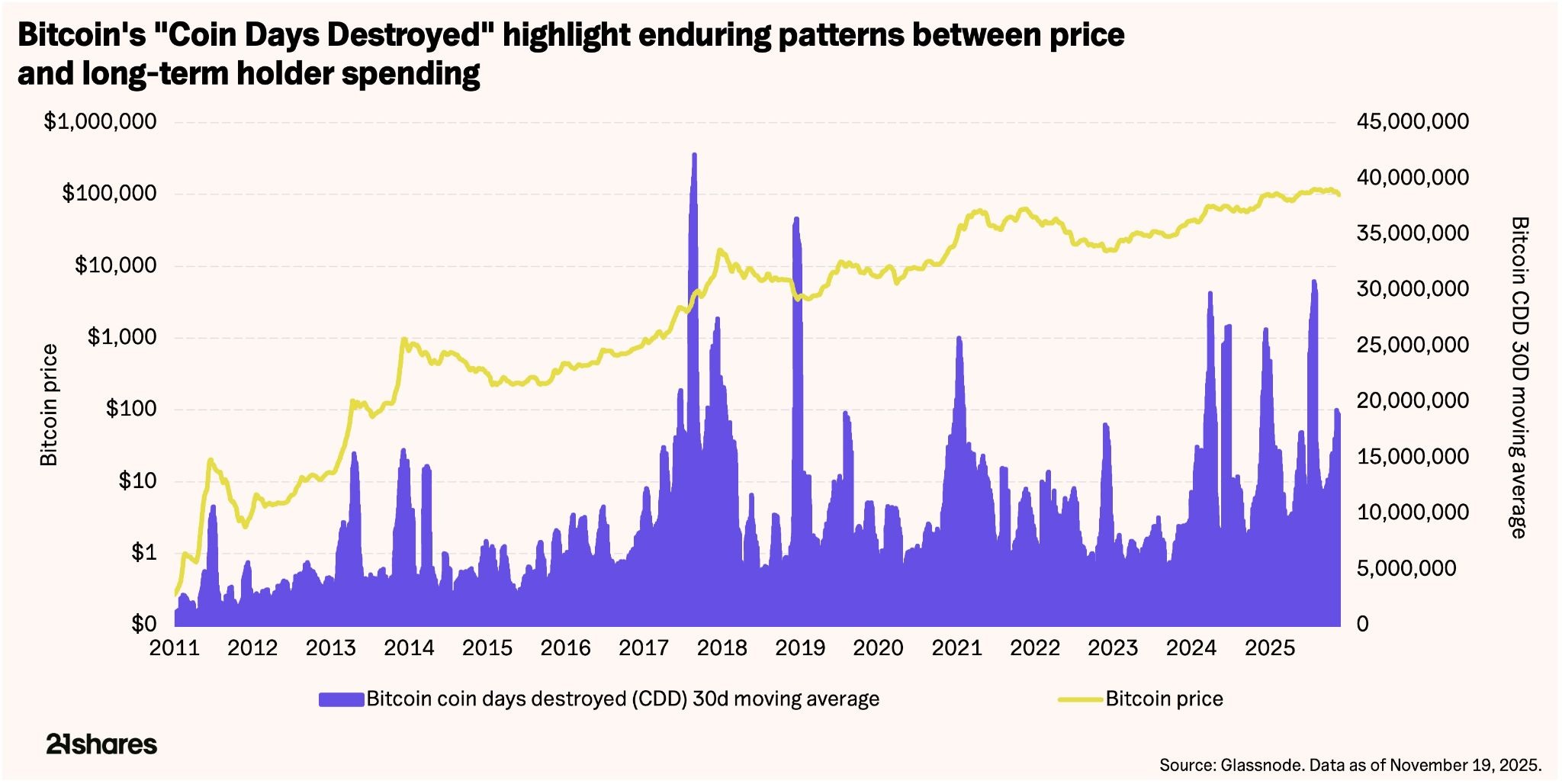 • On the other hand, Coin Days Destroyed (CDD), Bitcoin’s closest equivalent to long-term shareholder turnover, has remained important because it highlights when long-dormant coins begin to move. This often reflects distribution from early investors to new holders. Spikes in this measure have continued to appear around market tops and bottoms, even after the launch of ETFs.