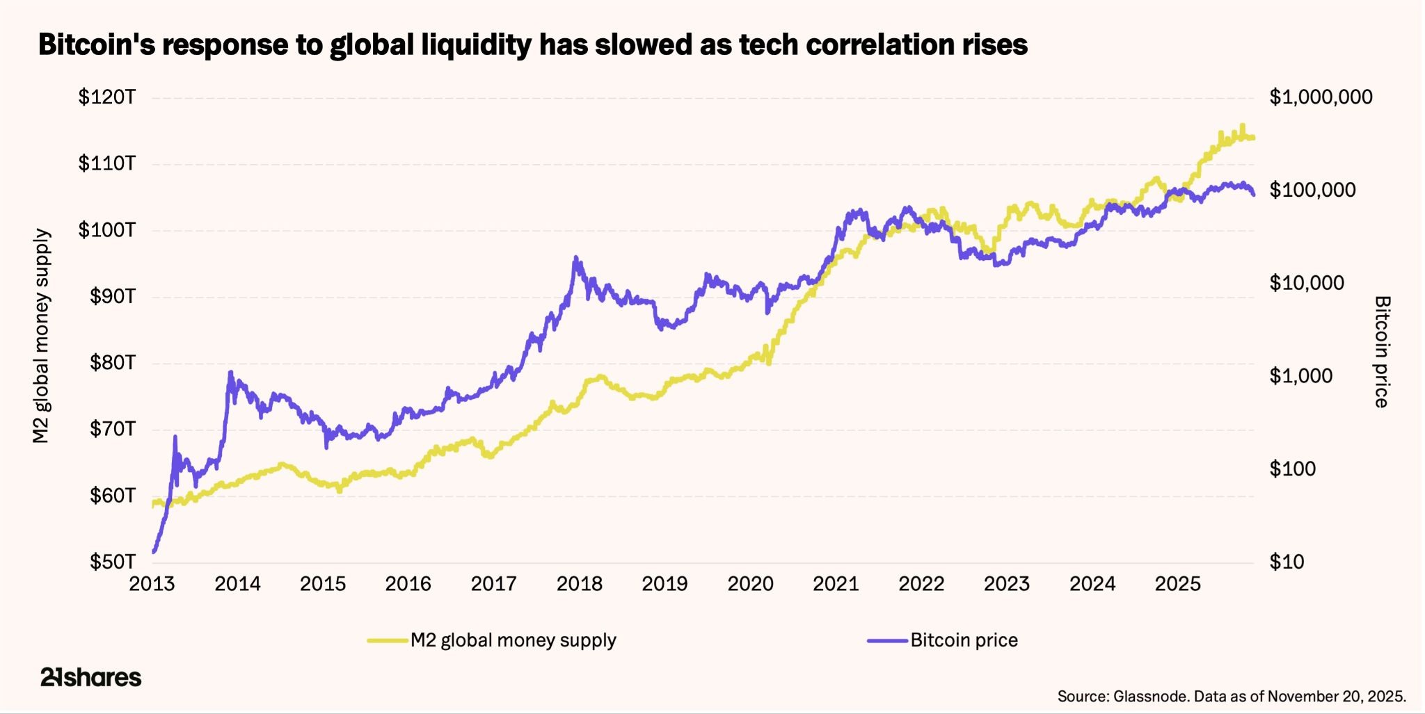 • Similarly, macro liquidity measures such as money supply growth and real interest rates have also gained importance as Bitcoin behaves more like a global risk asset. Its increasing correlation4 with major equity indexes has amplified volatility and made it more sensitive to valuation changes in artificial intelligence-related and broader technology markets, which some view as extended.
