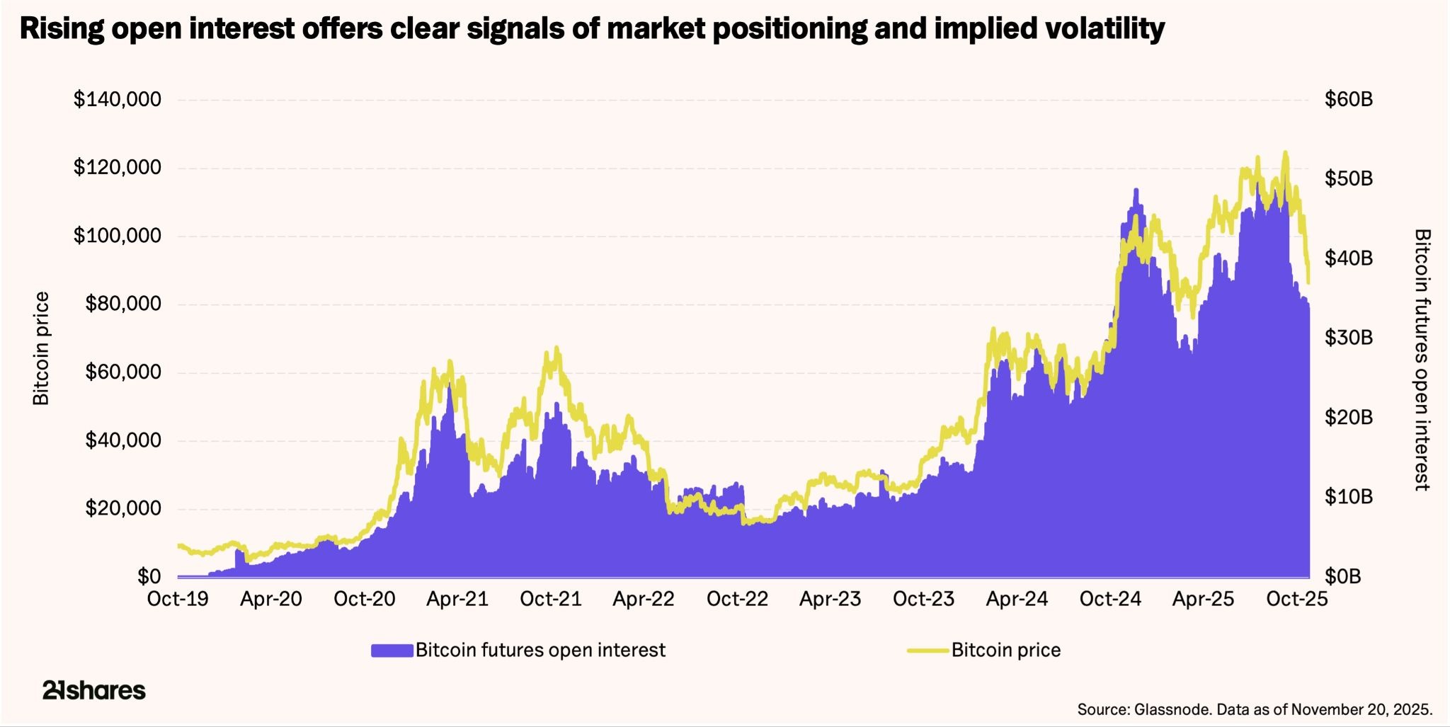 • Futures market data adds important context, especially as the derivatives market’s open interest has grown by roughly 500% since early 2020 and now represents a much larger share of Bitcoin market structure. Rising open interest often signals upcoming volatility, while shifts in funding rates help show how the market is positioned. Most interestingly, open interest growth of 50-90% has preceded major volatility spikes (Oct 2020–Apr 2021, Oct 2024–Nov 2024, Apr 2025–Oct 2025).