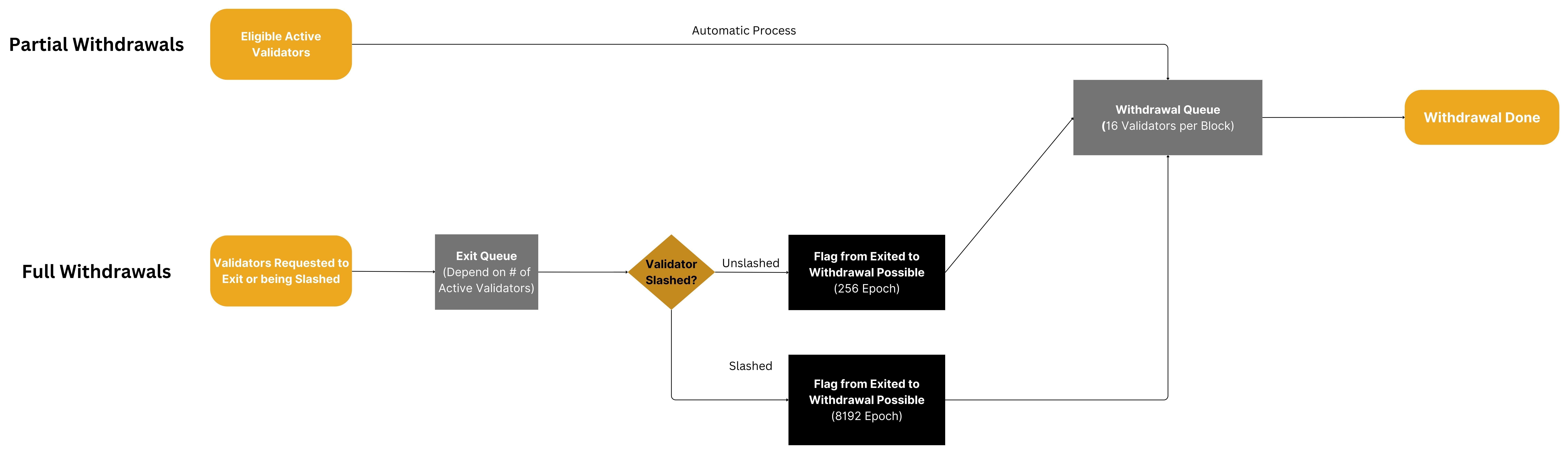 For full withdrawals, exiting validators must first go through the exit queue. With 602k validators, 9 can exit every epoch (2025 validators per day). After exiting the network, exited validators must wait for 256 Epoch (~27.3 Hours) if they are unslashed so that the network can flag them as “withdrawal possible”. The last step is going through the withdrawal queue, in which the network can process 16 withdrawals per block (115,200 withdrawals per day, assuming no missed block).