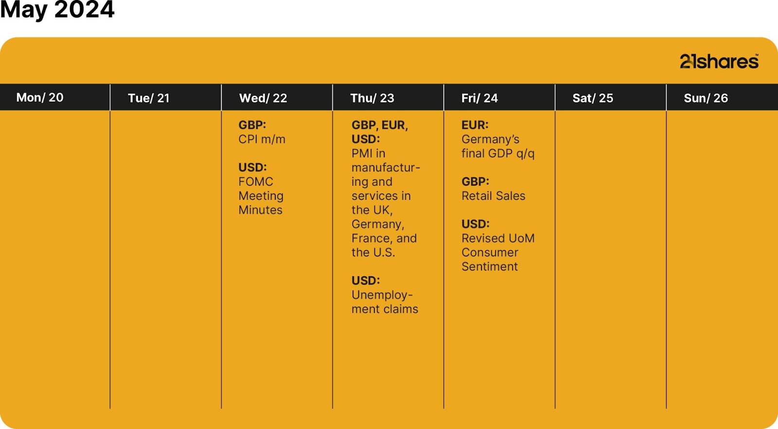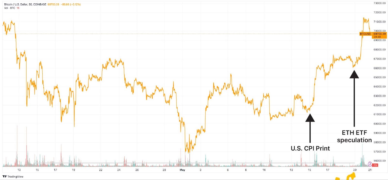 Nevertheless, the CPI news on May 15 was followed by a daily surge in Bitcoin’ price, jumping 7.5% to around $66K. Furthermore, on May 20, speculation around a potential ETH spot exchange-traded fund (ETF) in the U.S. sent the market on an even bigger rally, with Bitcoin and Ethereum surging by 13.6% and 24%, respectively over the past week.