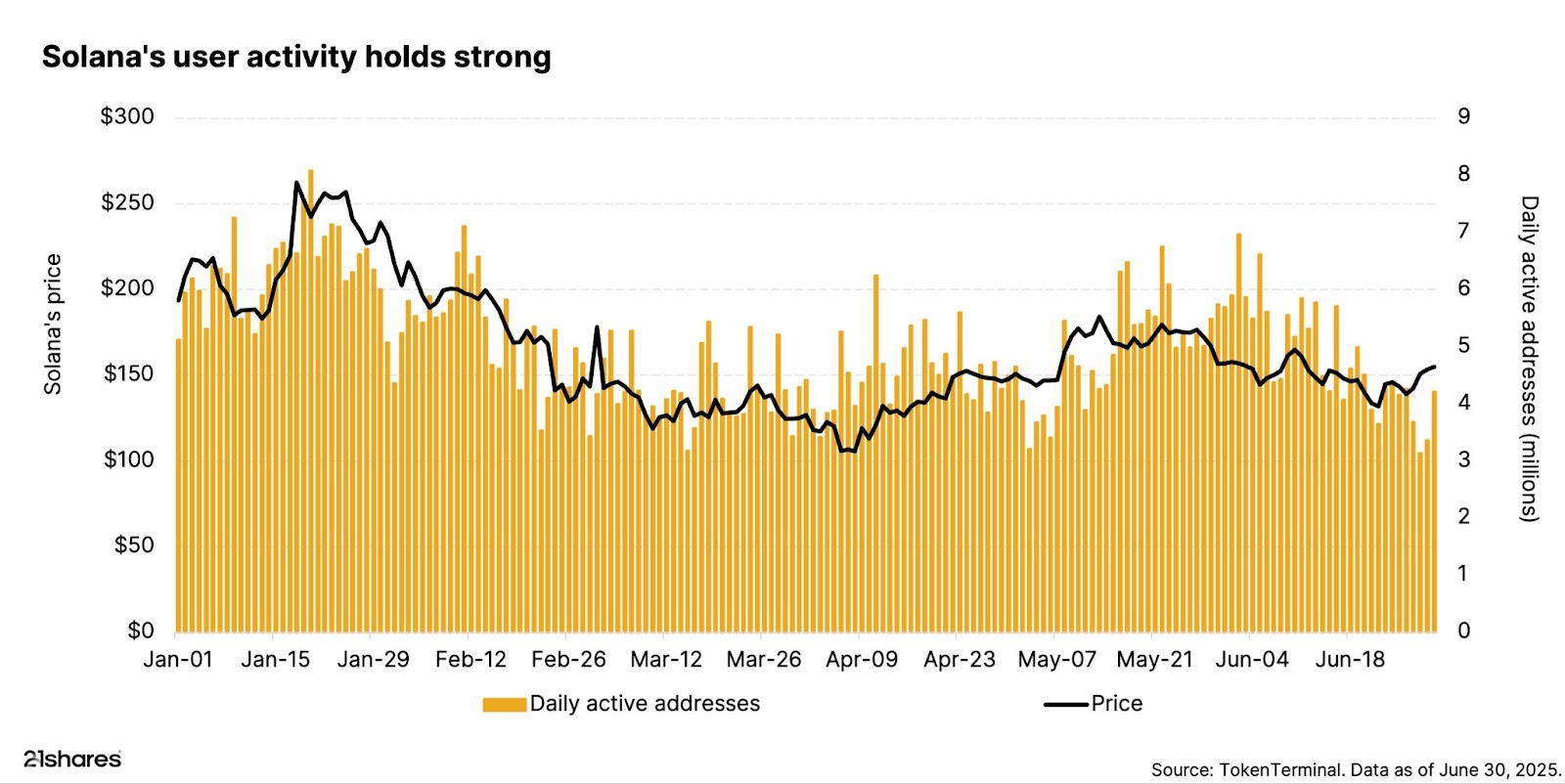 But there’s more to the story. Even though prices and trading volume dropped, Solana’s user activity stayed strong. Daily active users remained in the millions, and in June, Solana hit 7 million users in a single day, close to its all-time high in January during the peak of the political memecoin craze.
