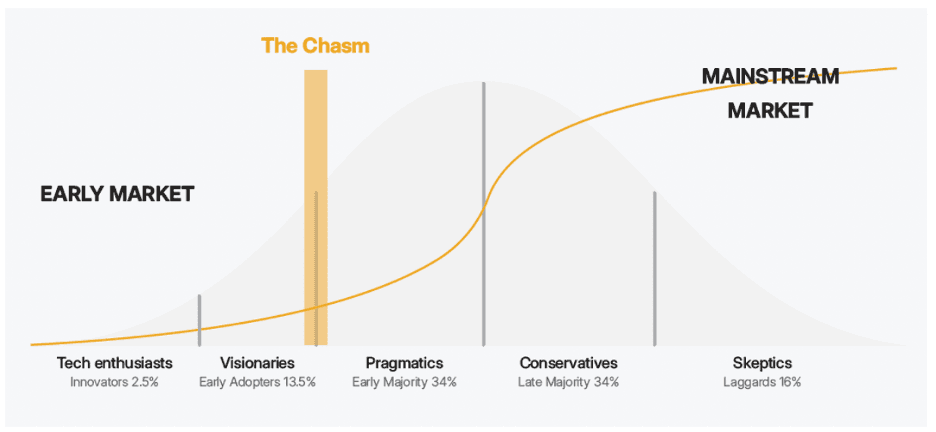 • One way to more accurately gauge a given cryptoasset’s level of penetration of its TAM is through the “S-curve.” The S-curve is a theory that states that technologies grow and emerge in multiple waves. It was initially proposed by E.M Rogers in 1962 as the Diffusion of Innovation (DOI) Theory to explain how, over time, a new technology gains momentum and spreads through a specific population or social system.