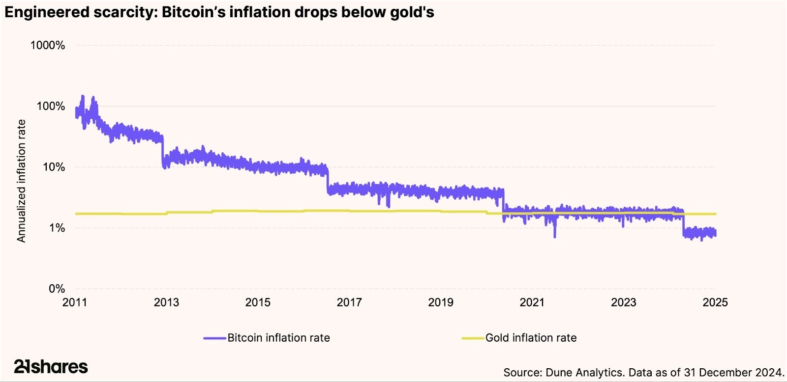This hard limit makes its long-term inflation rate predictable and structurally lower than gold’s. As investors increasingly seek protection from currency debasement, Bitcoin’s transparent, programmatic supply schedule stands in sharp contrast to the flexibility of central banks and governments. It effectively positions Bitcoin as a modern, digital version of “hard money”, one immune to excessively expansive fiscal policy.