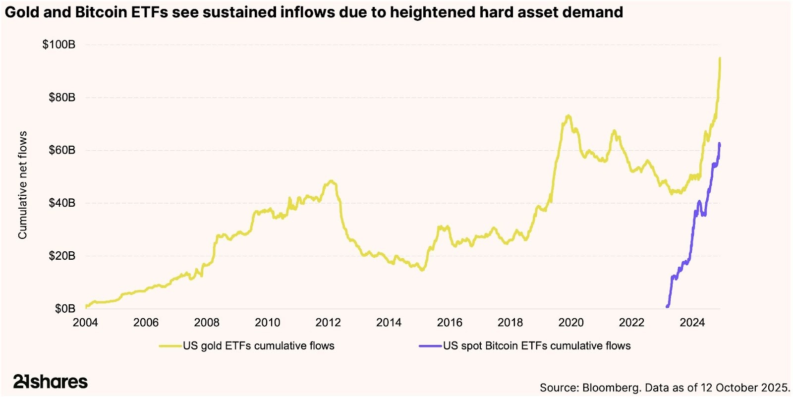 Global demand for gold ETFs has surged this year, with $64 billion in inflows year-to-date and a record $17.3 billion in September alone1. This marks a sharp turnaround from the $23 billion in outflows recorded over the previous four years, underscoring investor demand for tangible stores of value. By contrast, Bitcoin ETF flows have been more volatile but remain structurally positive, with $30 billion in inflows year-to-date and $3.9 billion in September (including Future ETFs in the US). The relative calm in Bitcoin inflows alongside its still-wide performance gap to gold suggests a potential “catch-up” trade as investors rebalance portfolios into year-end.